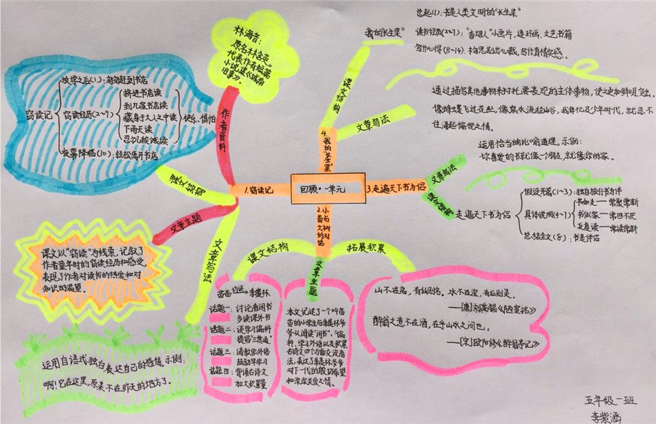 學生對機械地寫作業(yè)并不感興趣,甚至會感到厭煩,效果不好。而他們往往對畫畫感興趣,畫半個小時都不覺得累。這樣的學習方法,能讓孩子們更有興趣學習,化被動為主動。因此運用思維導圖完成作業(yè)學生的效率更高。因為有了跟著老師感受的基礎,孩子們一點就通。學生制作的思維導圖更有美感,他們的思維也不局限于一篇課文,而是會結(jié)合以前的所學融會貫。