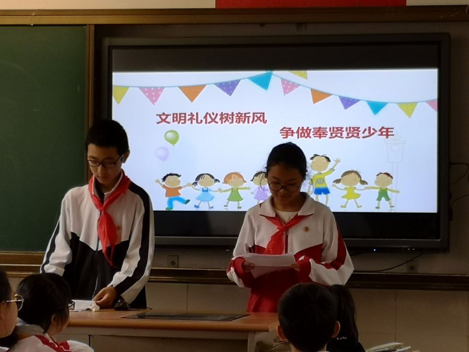 陳老師的班會課有兩個主題。先是《文明禮儀樹新風(fēng),爭做奉賢賢少年》。針對本班學(xué)生存在的亂丟紙屑、垃圾,不知道尊重其他同學(xué)的勞動成果等不文明現(xiàn)象,陳老師做了精心的設(shè)計(jì)。課從“賢”字入題,引導(dǎo)學(xué)生思考“賢”包含的意義,并通過賢人的故事交流,增強(qiáng)學(xué)生對“賢人”的崇敬和向往。接著通過小品,讓學(xué)生尋找、發(fā)現(xiàn)自己身邊的不文明現(xiàn)象,思考該如何做一個“小賢人”。