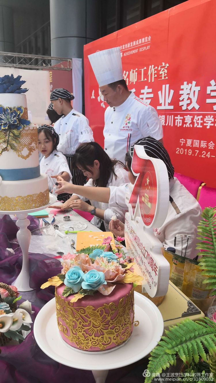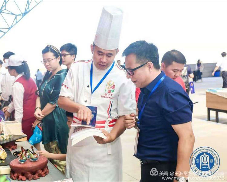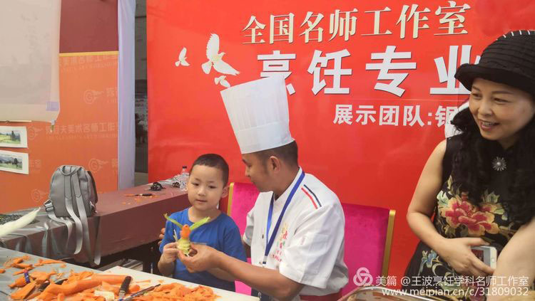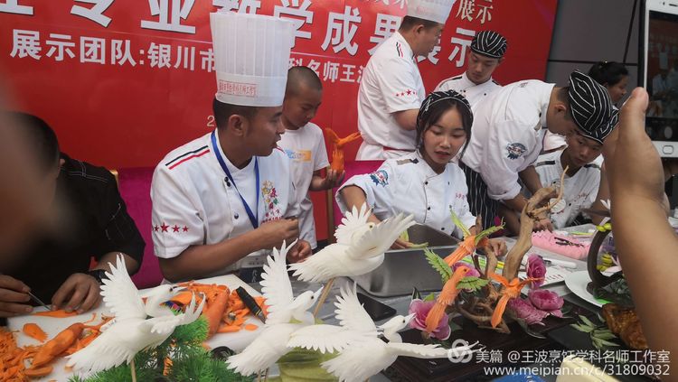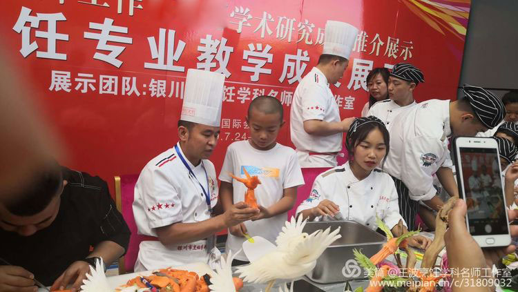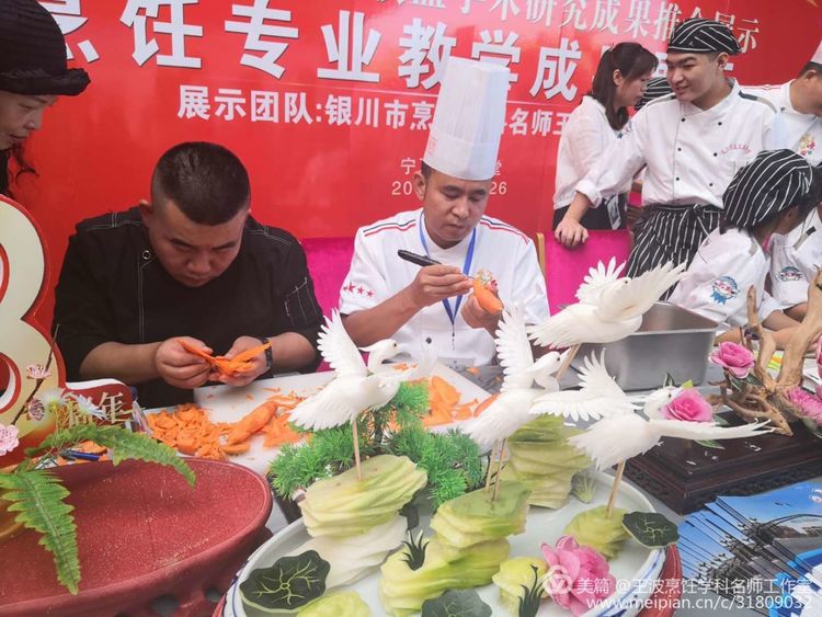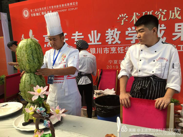 我們工作室的展臺(tái)獨(dú)樹一幟。王波導(dǎo)師親自帶領(lǐng)銀川職業(yè)技術(shù)學(xué)院烹飪專師生現(xiàn)場(chǎng)演繹食品雕刻藝術(shù),吸引了眾多名師駐足觀望。展臺(tái)上布滿老師們的食品雕刻作品、色香味
