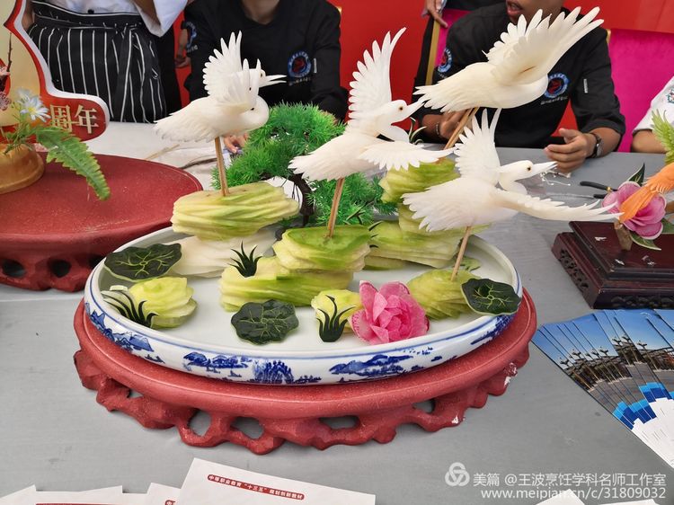俱全的面點(diǎn)等各種菜肴。老師以常見的蔬菜、瓜、果等為原料,通過切、旋、削、戳、刻等手法,把它變成玲瓏剔透、栩栩如生的仙鶴、云雀、盆景、飛鳥等,化平凡為神奇,