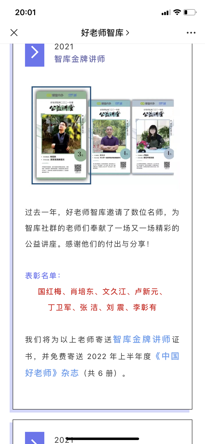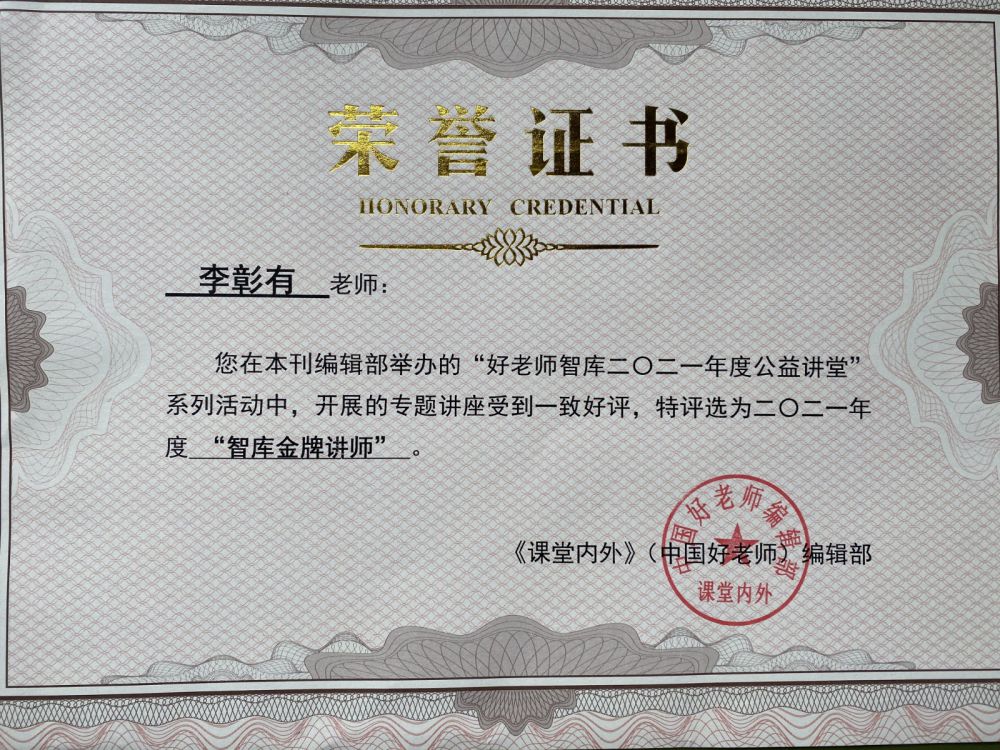 2021年,好老師智庫邀請了數(shù)位名師,為智庫社群的老師們奉獻(xiàn)了一場又一場精彩的公益講座。南京市江寧高級中學(xué)李彰有等8人2022年元月,被好老師智庫評為智庫金牌講師,并寄來證書和2022 年度《中國好老師》雜志。李彰有在教師專業(yè)成長、名師工作室建設(shè)、班主任工作、政治課教學(xué)等方面的講座,又較強(qiáng)的針對性和指導(dǎo)性。