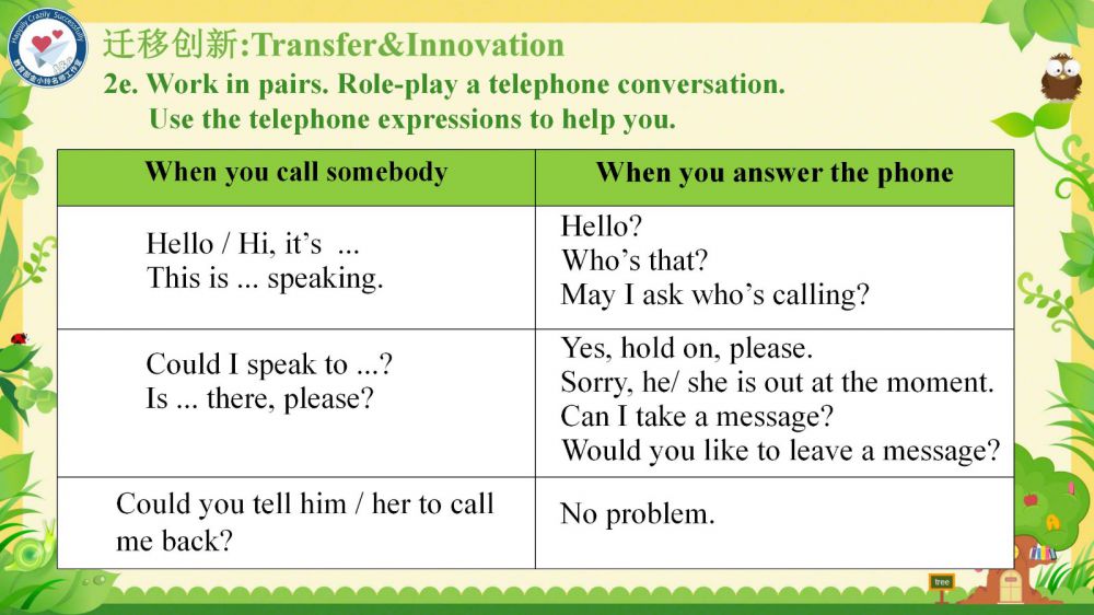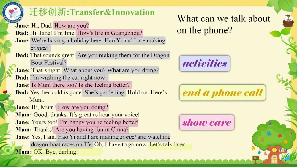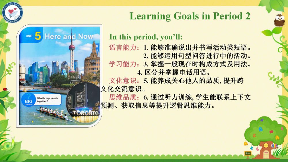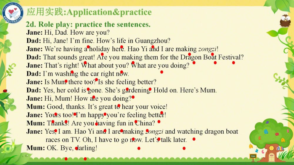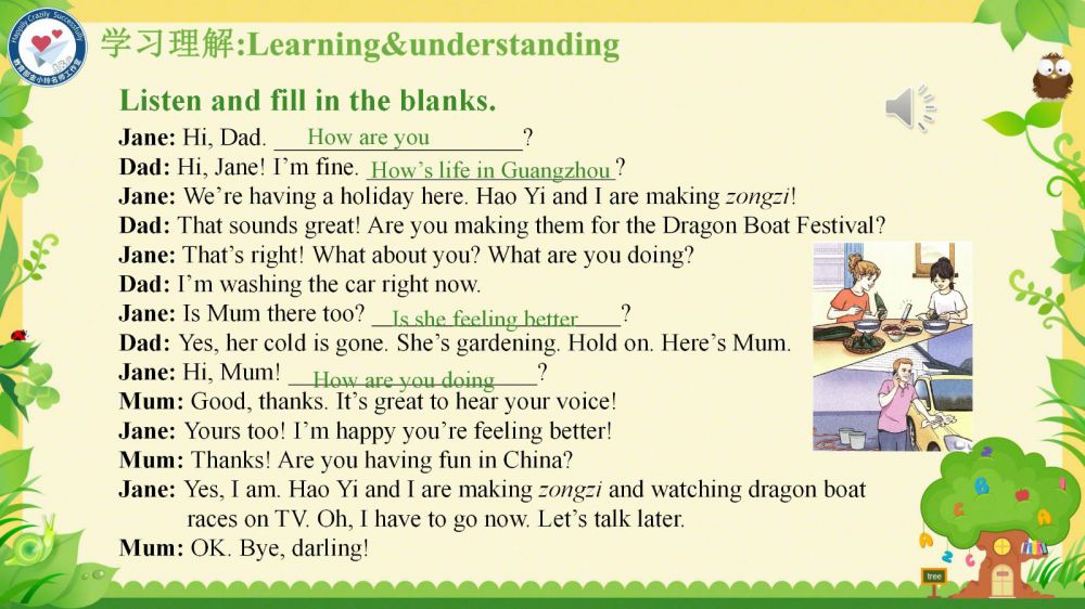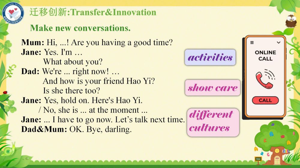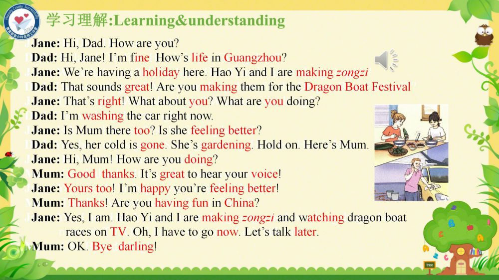 本課件秉承教育部金小玲名師工作室的快樂英語教學(xué)理念,以“語言為基、思維為翼、文化為魂”,通過真實(shí)情境創(chuàng)設(shè)和任務(wù)驅(qū)動(dòng),引導(dǎo)學(xué)生在真實(shí)的語境中學(xué)習(xí)和掌握關(guān)于家庭交流、節(jié)日習(xí)俗以及日常活動(dòng)的詞匯和表達(dá)方式,理解家庭成員間的關(guān)愛與溝通,增強(qiáng)他們的家庭觀念和情感認(rèn)同——在語言學(xué)習(xí)中涵養(yǎng)積極人生觀,達(dá)成“工具性”與“人文性”的統(tǒng)一。